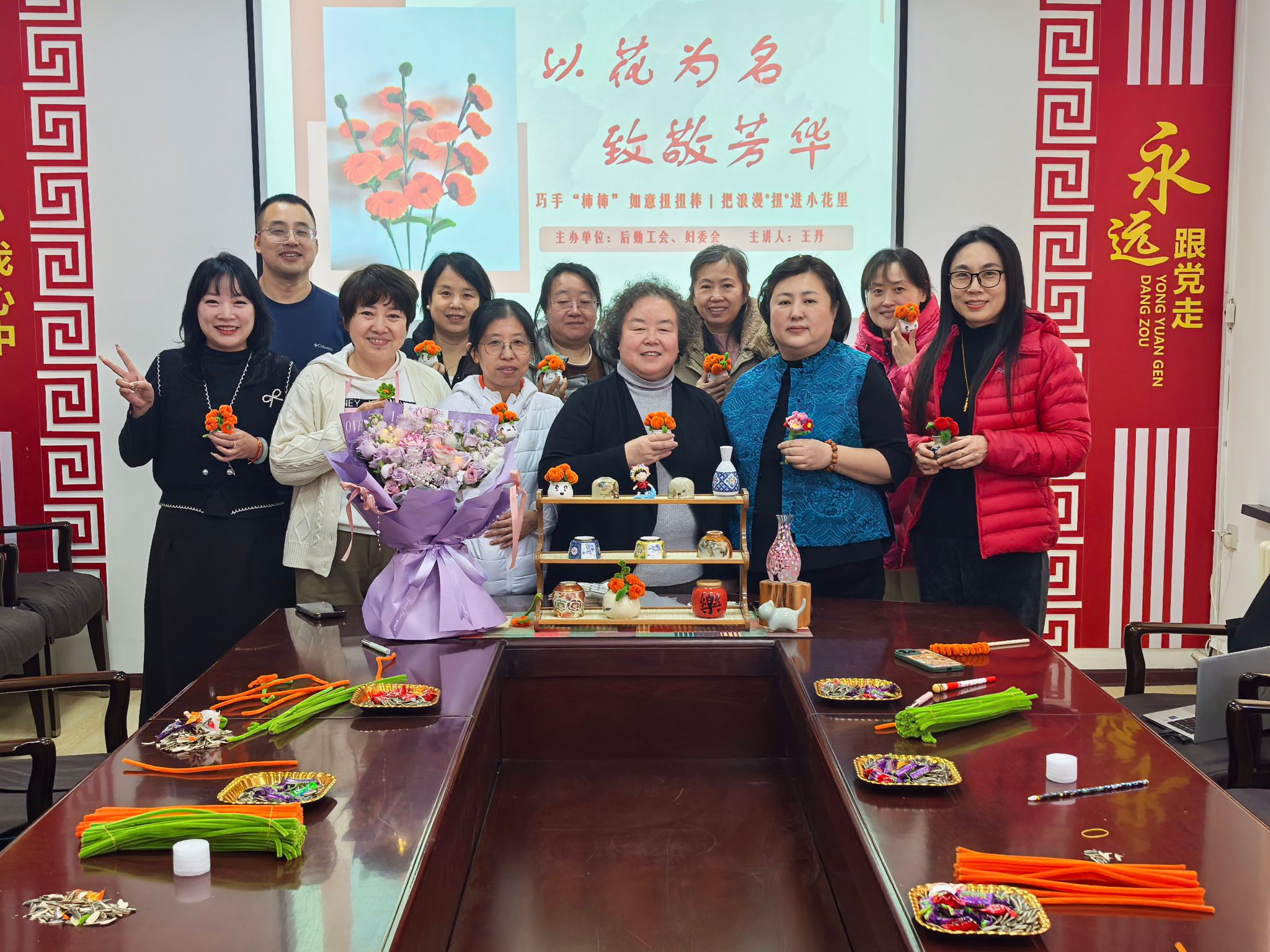 活动最后,全体女职工手持亲手制作的扭扭花束合影留念,用镜头定格温馨美好的瞬间。此次活动不仅让大家在动手实践中舒缓了工作压力、收获了动手乐趣,更展现了后勤女职工热爱生活、积极向上的巾帼风采。 (初审:费立刚 复审:赵爽 终审:常惊宇)